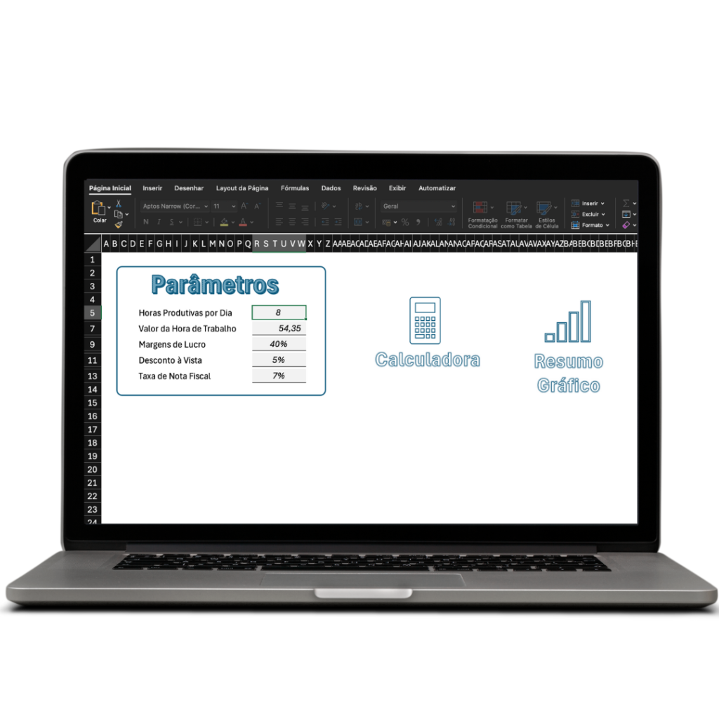 Aqui, você vai levantar todos os custos – materiais, mão de obra, taxas e honorários – para garantir que não está pagando para trabalhar. Tudo é automatizado, então você só preenche os dados e a planilha faz os cálculos para você.