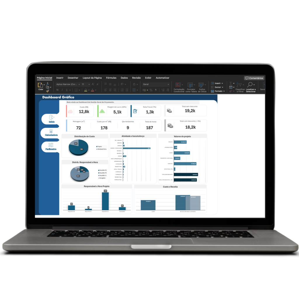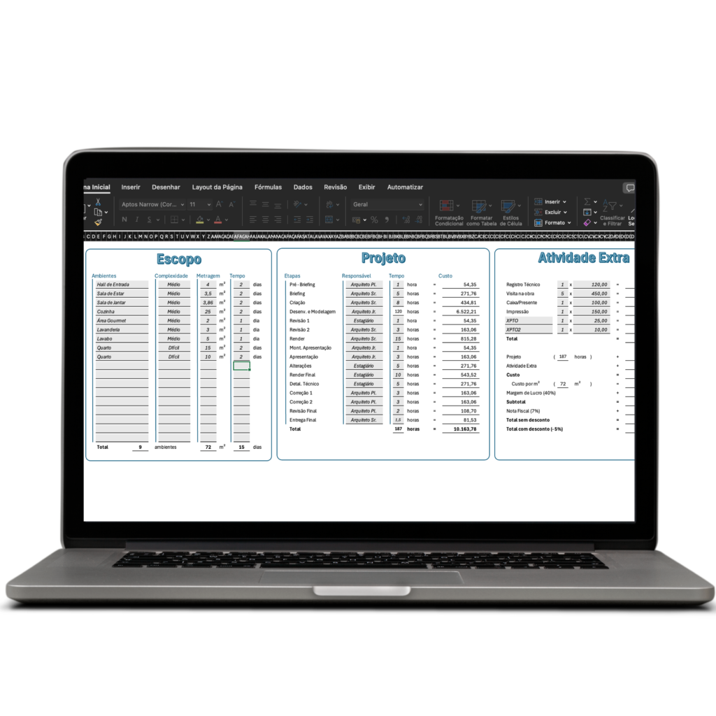 Aqui, você preenche os detalhes do projeto – ambientes, extensão, complexidade e tempo estimado – e a planilha faz o cálculo automaticamente. Tudo é automatizado , garantindo um orçamento preciso e sem surpresas.